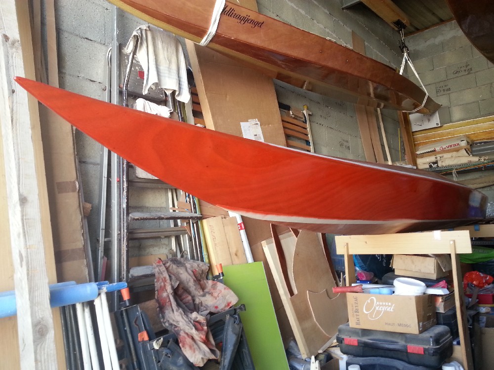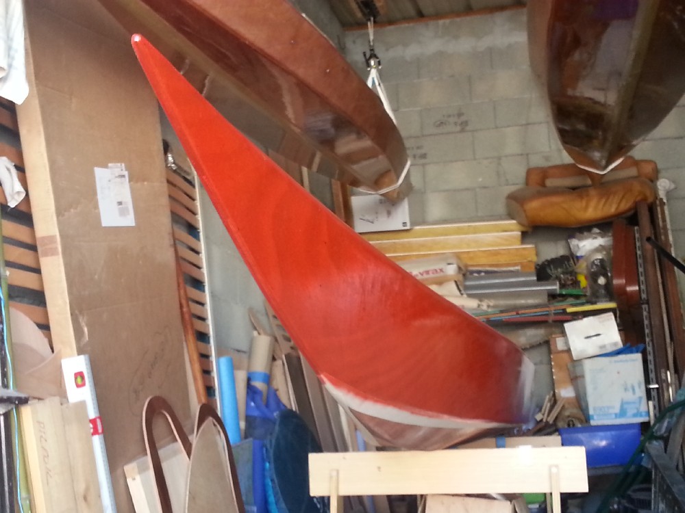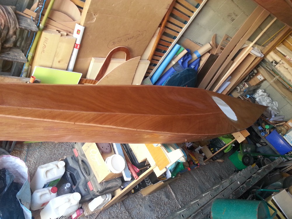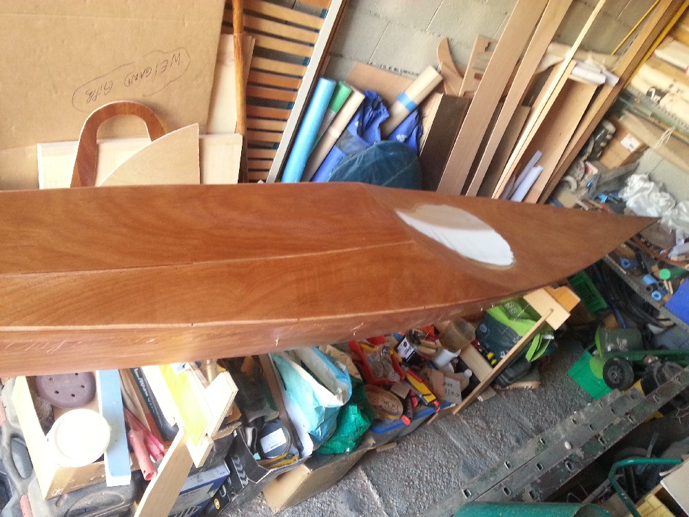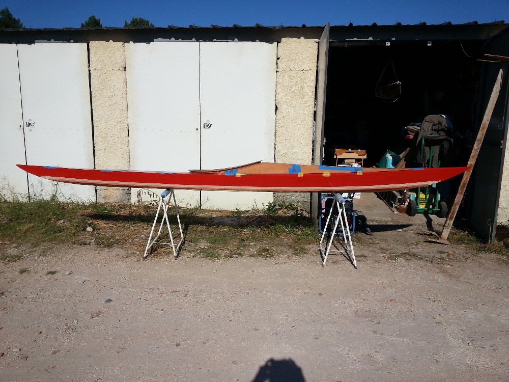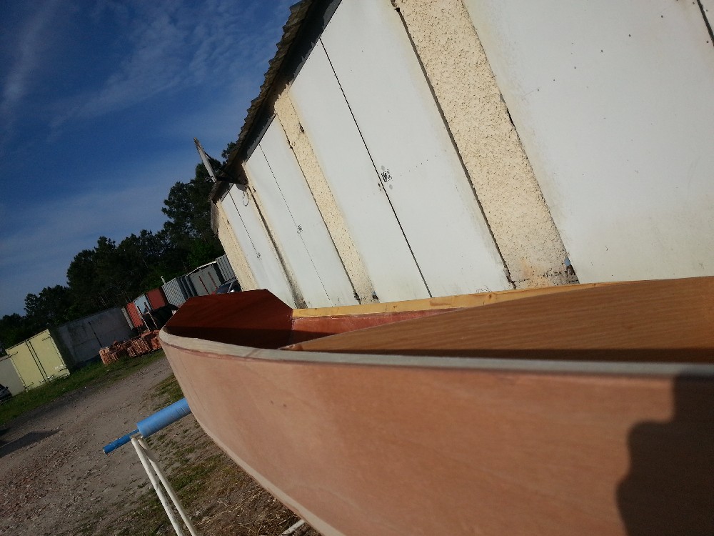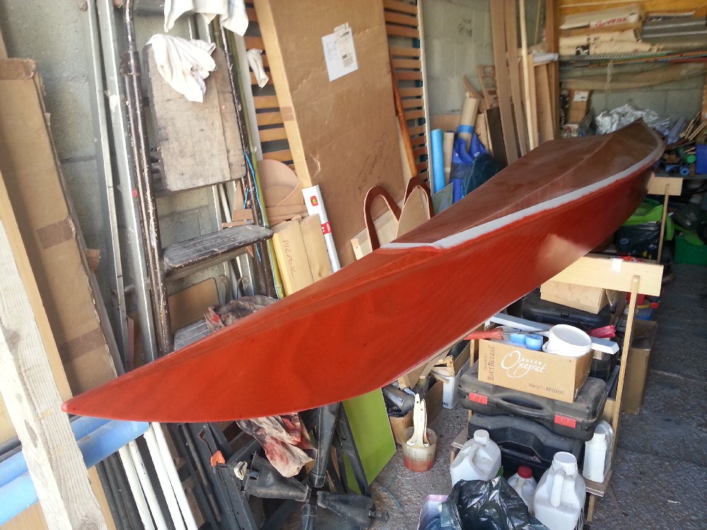 Mise en couleur des cotés. Ce sont les dernières photos de l'album. J'ai passé la deuxième couche le lendemain des prises de vues. Depuis hier soir, je rempli la trame de pont pour mettre à niveau avec les cotés. Ensuite 2 couches d'époxy claire sur le pont et les cotés, puis ponçage de l'ensemble pour avoir un aspect satiné. Restera le fond à traiter en 4/5 couches plus la bande d'aramide. Ensuite pose de l'hiloire et de l'accastillage, ainsi que la confection des trappes. Il reste beaucoup de travail !!!! Affaire à suivre. Gilles
