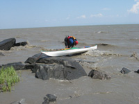 L’orage est à notre porte, je vide le kayak, qui est dans la batture, et je prends l’équipement de camping et mon sac de couchage. 400 mètres à marcher, j’installe le tout avant d’être mouillé. Première cigarette de la journée, je retourne chercher mon kayak. Le vent est fort, ça gronde un peu, j’ai le plaisir de faire glisser mon kayak sur la batture. Corde de remorquage sur la proue, je suis le bovin de service.