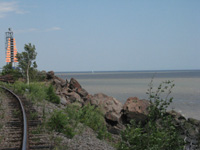 Environ 16h, le ciel devient de plus en plus gris et le vent d’ouest de 15 à 20 nœuds. Nous avons passé Sault-au-Cochon depuis un peu plus d’une heure et la recherche d’un campement est lancée. Finalement, mon frère trouve une petite ouverture dans la batture. Mince récompense, l’eau, peu profonde, nous fera économiser une trentaine de mètres sur les 400 que nous devrons marcher. Une petite plage assez haute, au pied du chemin de fer, sera notre emplacement (070 35’ 451’’ W 47 15 096 N).