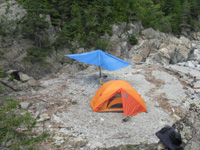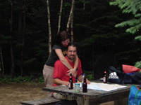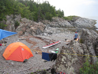 Une belle plage de roche (070 13’ 50’’ W 47 29’ 30’’ N), nous serons à l’abri. Cap-aux-Oies, excellent choix. J’ignore s’il est permis de camper sur les berges, mais dans la forêt, juste derrière : Propriété privée. Quelques panneaux pour annoncer la chose, dont ma favorite « Attention ! Chasseur à l’affût. » Nous resterons sur les cailloux. Une tente, une bâche pour se mettre à l’abri de la pluie, un feu et un nid de guêpes comme voisin.