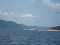 Après la Malbaie débute le parc marin du Saint-Laurent. En guise de bienvenue, nous avons quelques bélugas qui nagent tranquillement ici et là. Ils ne sont pas très loin, il est possible de les observer et de les entendre respirer, mais ils ne s’approchent nullement des kayaks. Nous ne cherchons pas, d’ailleurs, à nous en approcher. Nous les laissons tranquille. Si parfois, un béluga s’approche de nous, nous arrêtons de pagayer. Il ne reste que quelques instants avant de disparaître sous l’eau.