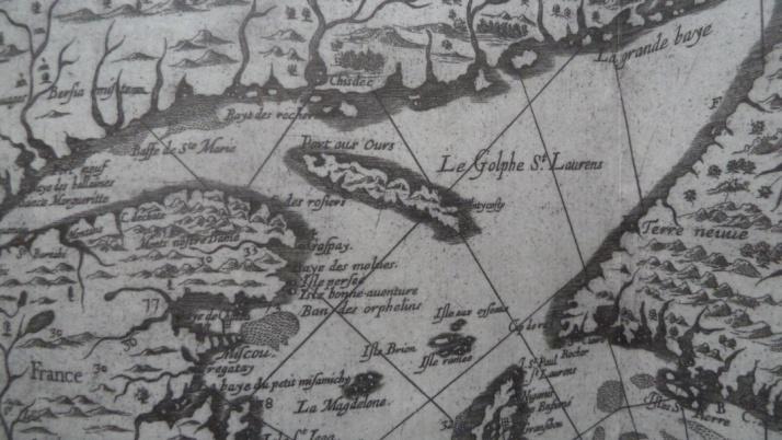 Extrait de la carte de Cornelis de Jode publiée en 1593-On y aperçoit Anticosti bloquant le golfe.