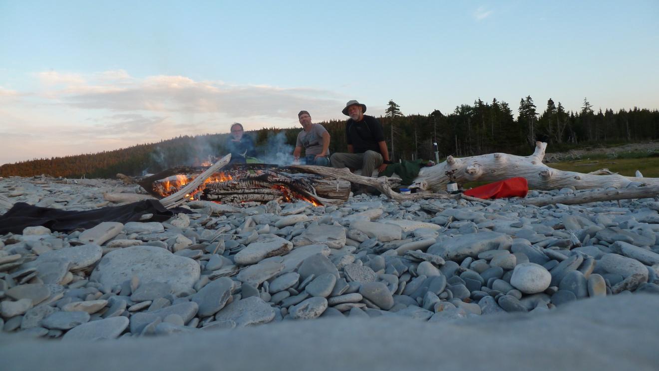 Le paysage devient grandiose avec les falaises qui se succèdent. Parfois, elles rappellent la Haute-Egypte avec la roche dorée. Sur le calcaire se dessinent des hiéroglyphes naturels écrits par Eole et ses grands airs de flancs mous. Des physionomies pharaoniques et des nez Abénakis se dessinent dans les feuilles friables du roc . D’ailleurs le reef est disparu depuis Puyjalon et il ne réapparaitra plus jusqu’à la rivière aux saumons. A l’embouchure de la rivière Observation nous aurons droit, par l’homme de feu, à un brasier qui enlumine le ciel jusqu’à Mingan. Nous sommes campés sur de la grosse roche éclatée et sur un lieu à découvert. Heureusement , il ne pleut pas.