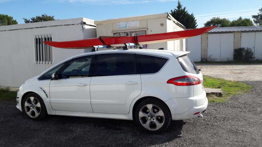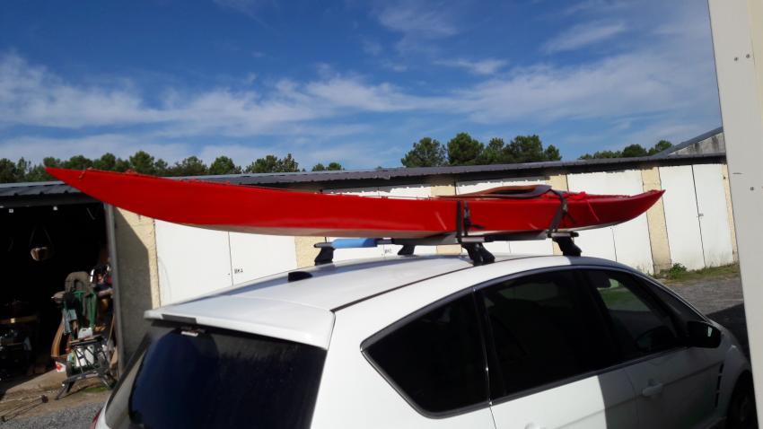 Bonjour Popeye, Personnellement je n'utilise que mes barres avec des mousses ( mousse d'isolation pour tuyaux d'eau ). Mes kayaks pèsent tous moins de 20 Kg, et je les porte sue l'épaule. En général je pose l'avant du kayak en premier sur sa barre, puis l'arrière. Il faut dire que j'ai l'épaule qui arrive au niveau du toit de mon Ford S-Max. Sur les photos, c'est un 15', mais je fais la même manip avec mes 17' et mon 18'. | |||||||||||||||