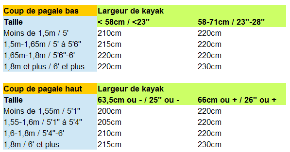 Salut Mario, Le choix de la longueur de la pagaie dépend de plusieurs facteurs, dont le type d'utilisation, la technique de pagaie (angle haut ou bas), la largeur du kayak et la hauteur du pont mais il y a aussi un aspect de préférence personnelle qui peut également faire varier la longueur avec laquelle tu seras confortable. On peut donc calculer une longueur idéale théorique mais tu dois également ajuster à ta préférence. Un article générale sur le choix de la pagaie: http://www.kayakdemer.net/documents/index.php?art=1 Voici un tableau (basé sur le site de Werner) qui est un bon point de départ pour le choix de longueur d'une pagaie: ![]() | |||||||||||||||