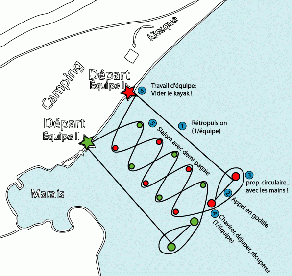 - 2 équipes à la fois, chacune composée de 2-4 kayakistes, se feront "compétition" (...), sous les encouragements délurés des spectateurs enthousiastes mais déçus de ne pas avoir participé, pour que tour à tour tous les concurrents de chaque équipe complètent le parcours. La première équipe dont le dernier concurrent aura terminé de vider le kayak sera gagnante. Au besoin