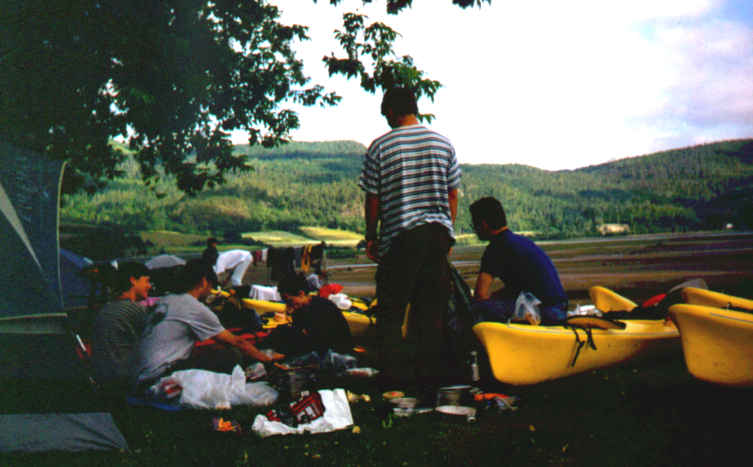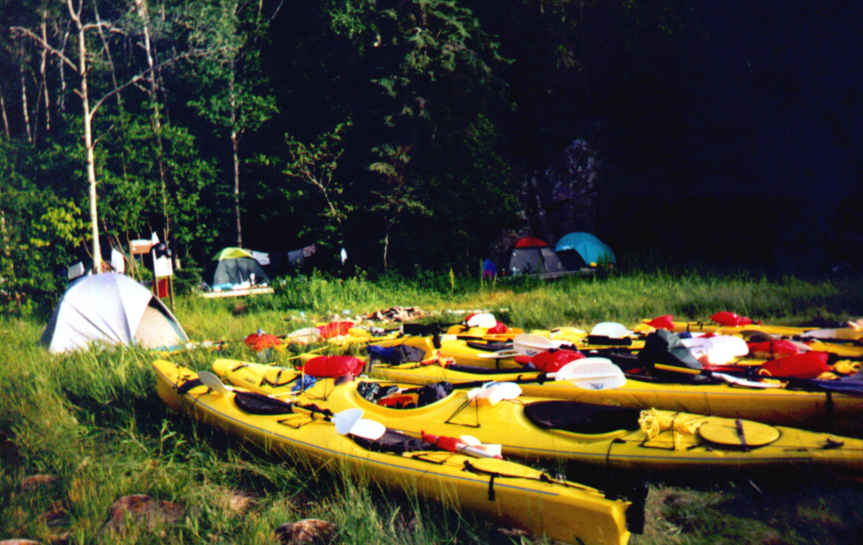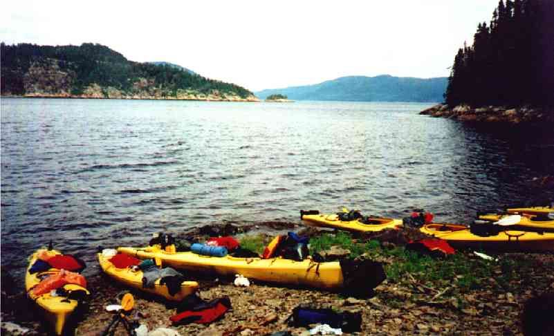 | Faute d'arbre près du bord, les campeurs de la tente grise feront office de gardiens des kayaks. |